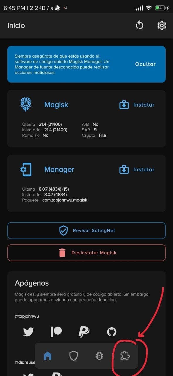 Una vez instalado el magisk y que ya tengamos Root en nuestro dispositivo, procedemos a abrir el magisk e irnos al apartado de módulos